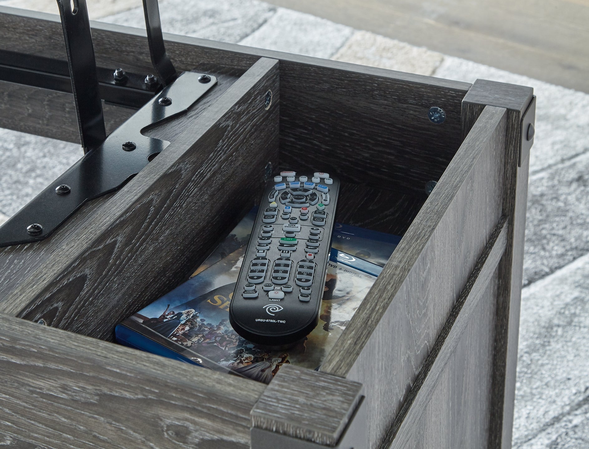 Open the door to modern farmhouse style with this lift-top coffee table. The beautiful woodgrain look and classic crossbuck metal accents are a cool touch, while the lower shelf provides surface space for fashionable home accessories. Sporting a gray replicated wood grain effect, its handy spring-loaded mechanism brings the tabletop closer to you. This versatile table makes it easier than ever to eat, work or play from the comfort of your sofa.