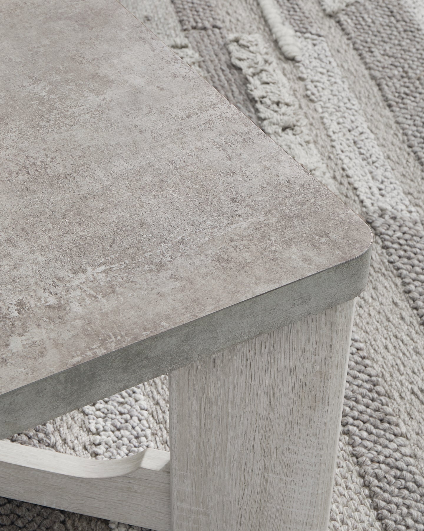 Details Includes coffee table and 2 end tables, Made with decorative laminates and MDF substrate, Frame with whitewash wood grain finish, Faux cement melamine tabletop, MEGA-TUFF® melamine surfaces are made of easy-clean melamine which is heat-, scratch-, water- and stain-resistant, Assembly required