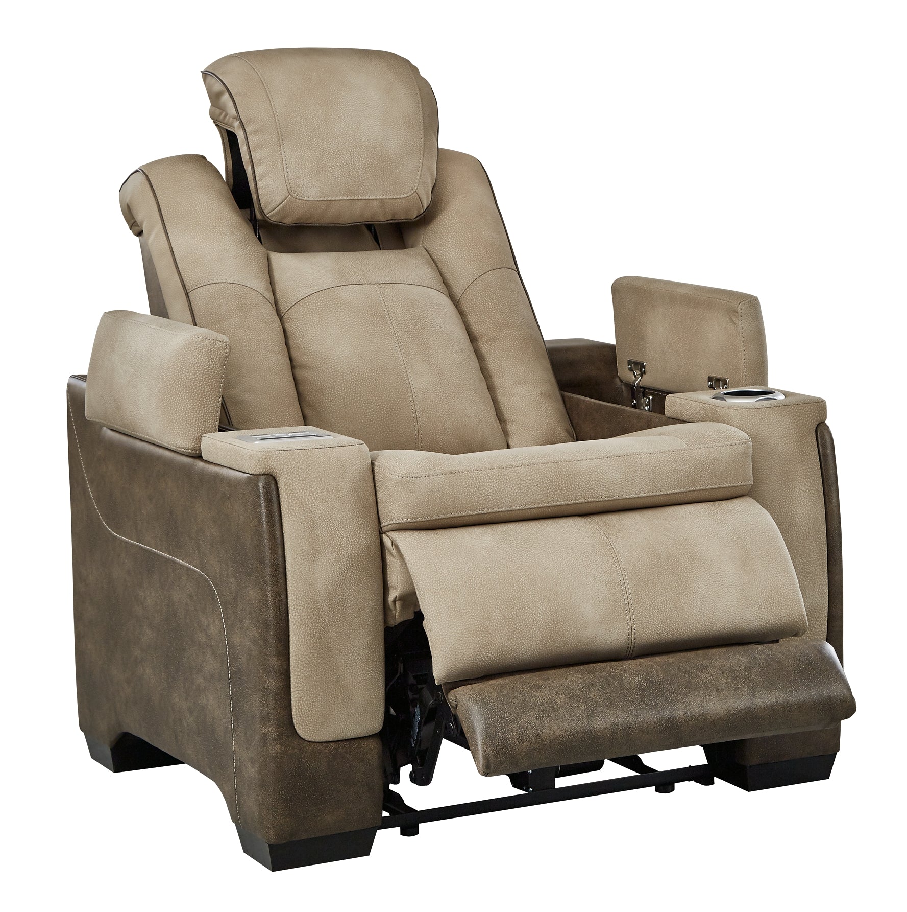 This sleek, ultra-modern power recliner has it all. With designer style and head-to-toe comfort, it has the upscale look of leather at a scaled-down faux leather price. Its two-tone upholstery is more durable and water-repellent than regular leather, an added bonus for families. Features including wireless and USB charging, an adjustable headrest and an extended ottoman make this the next generation of power recliners.