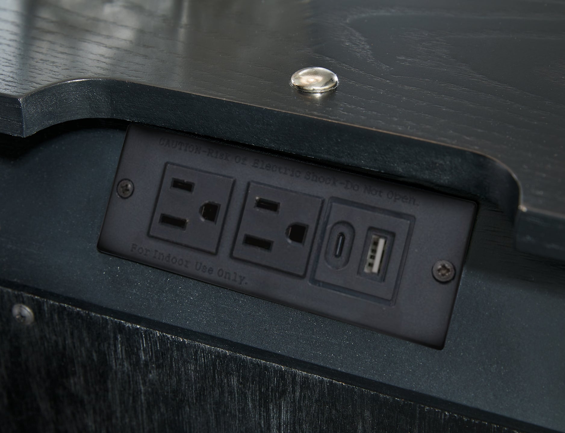 | Details | Made with hardwood solids and ash veneer, Black finish on textured wood grain surface, Brushed nickel-tone pulls, Waterfall edges, Smooth-gliding drawer with fully finished interior, dovetail construction and heavy duty ball-bearing side glides, Lower cubby shelf with built-in LED nightlight, 110V power supply with USB-A and USB-C charging ports, Power cord included; UL Listed | |